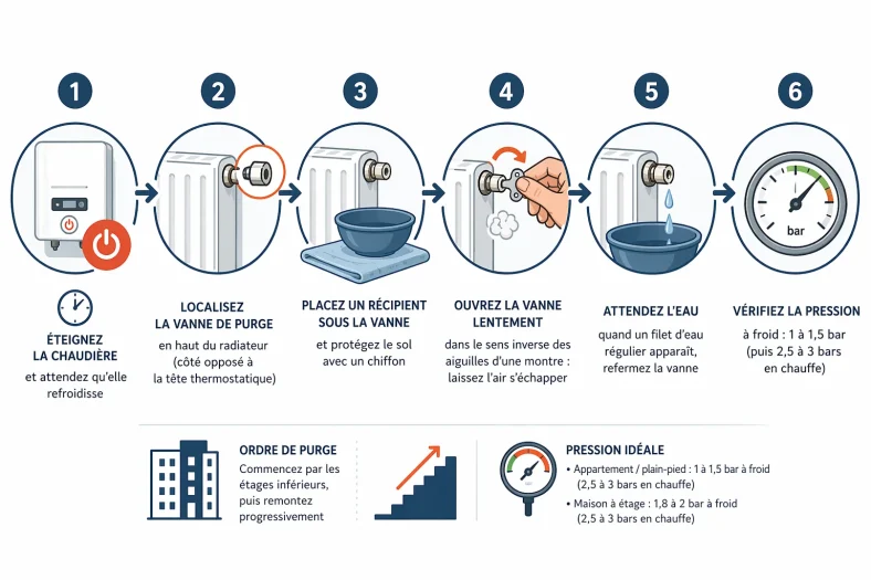 L’ordre de purge est crucial : commencez toujours par les radiateurs des étages inférieurs, puis remontez progressivement. L’air, plus léger que l’eau, monte naturellement — c’est la physique qui commande, pas moi.